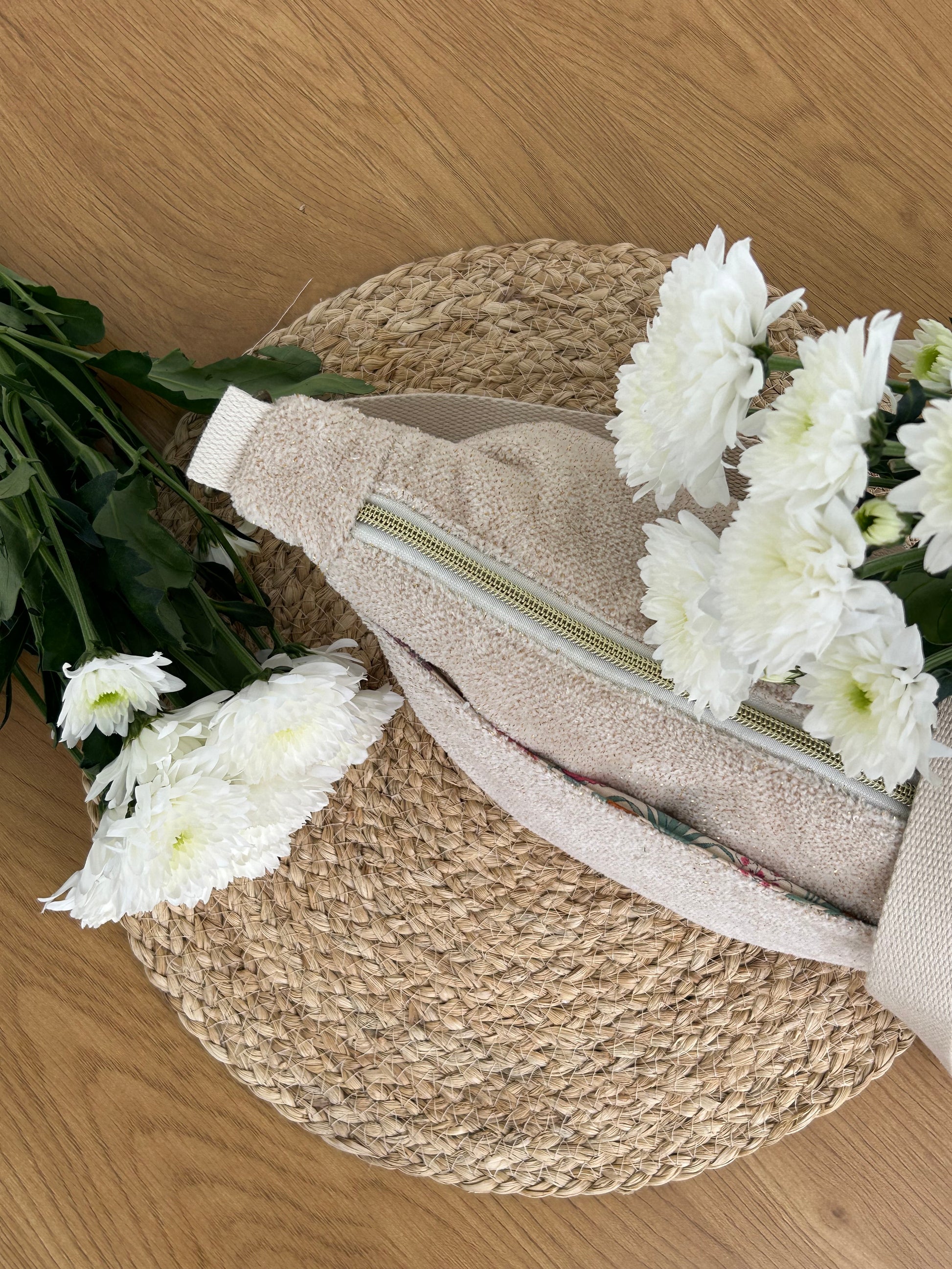 La banane beige à paillettes est pratique et confortable pour tous les jours. Sa forme demi-lune est unique et ses poches vous permettent de garder vos affaires organisées. Légère, elle se porte facilement, à la main, à l’épaule ou en travers.