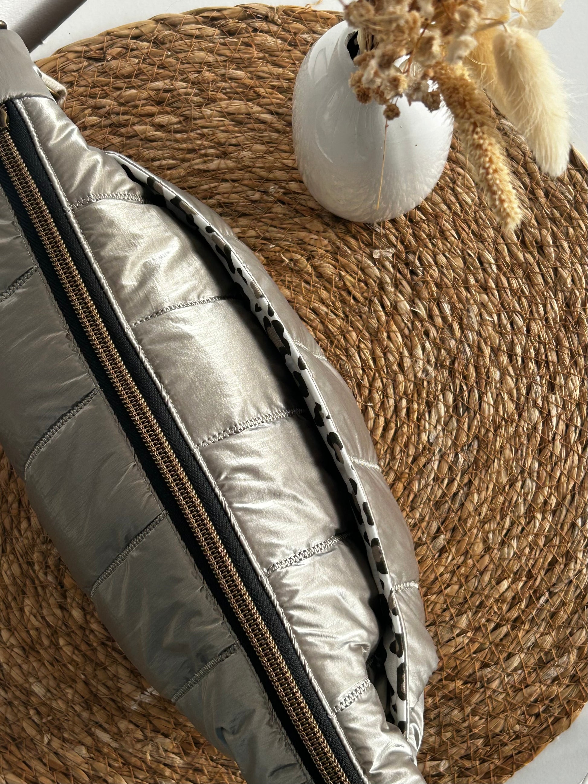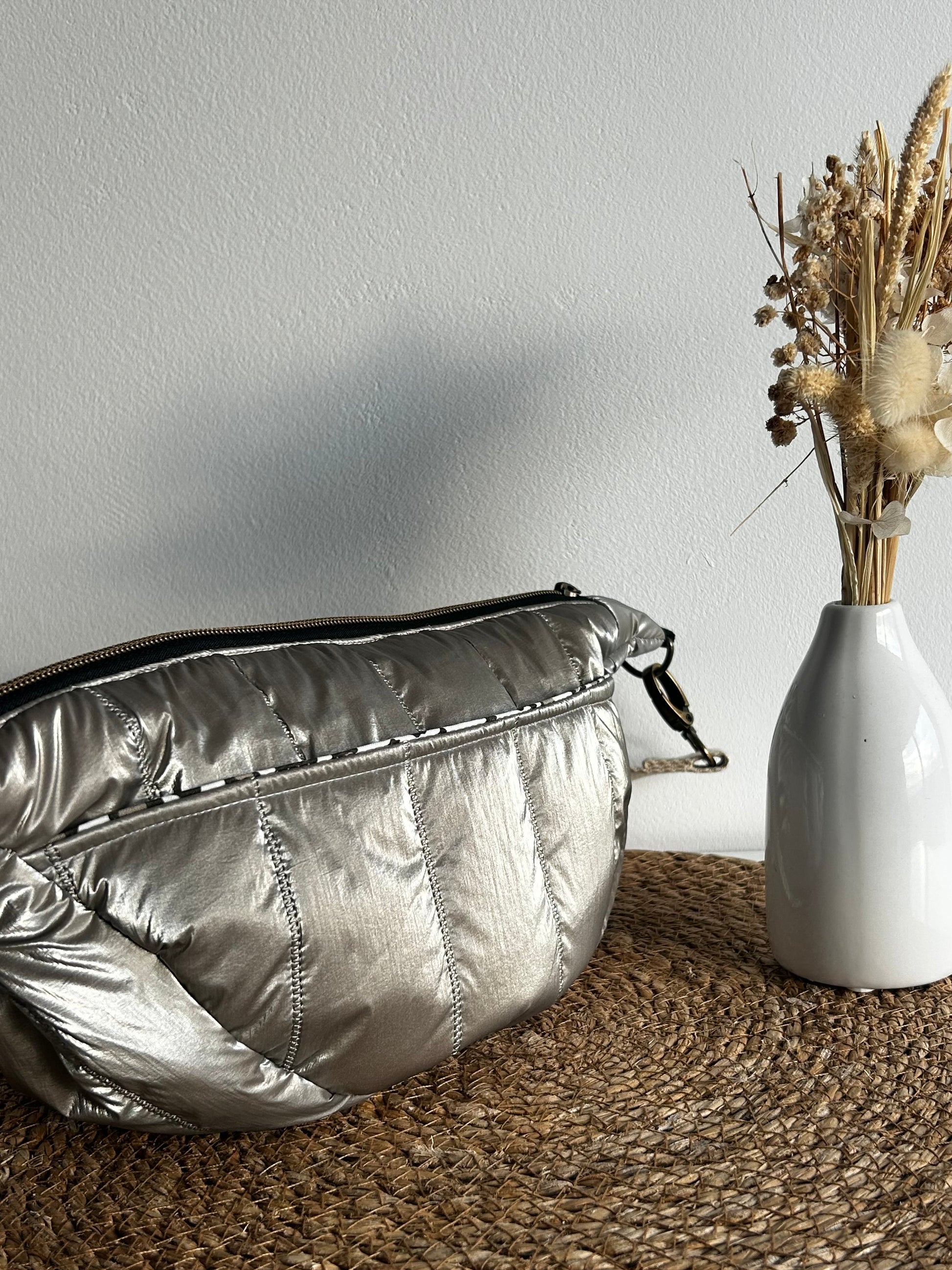 La banane matelassée grise est pratique et confortable pour tous les jours. Sa forme demi-lune est unique et ses poches vous permettent de garder vos affaires organisées. Légère, elle se porte facilement, à la main, à l’épaule ou en travers.